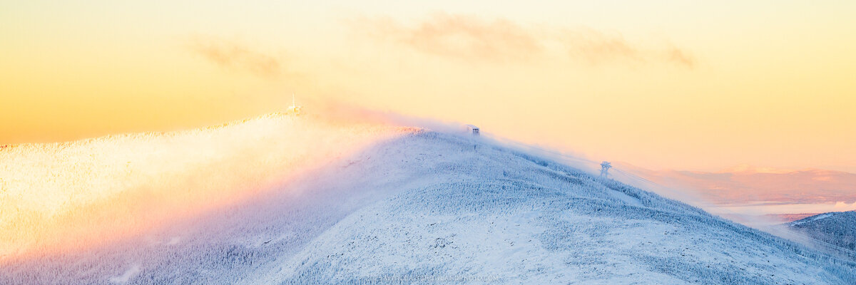 I took this photo while descending the Old Bridle Path from Greenleaf Hut. There’s a section of trail that traverses a ridgeline that curls back towards Franconia Notch and gives beautiful views of Franconia Ridge to the left and Cannon Mountain and the Kinsman Range to the right. This particular morning, the sun was rising and the alpenglow was lighting up the summit of Cannon Mountain, the tram station and second tram tower, and the huge snowmaking cloud blowing up and over the summit of the ski area.